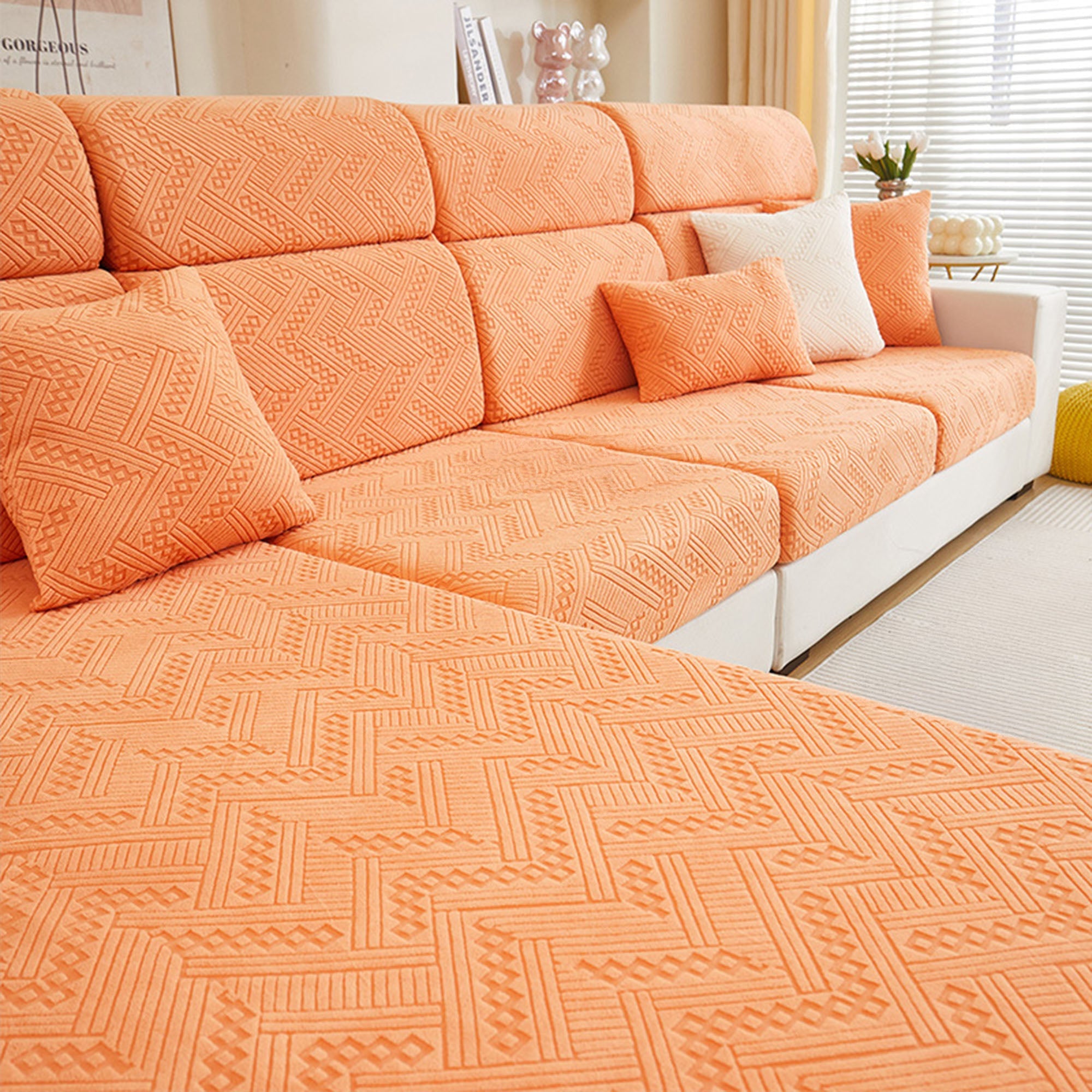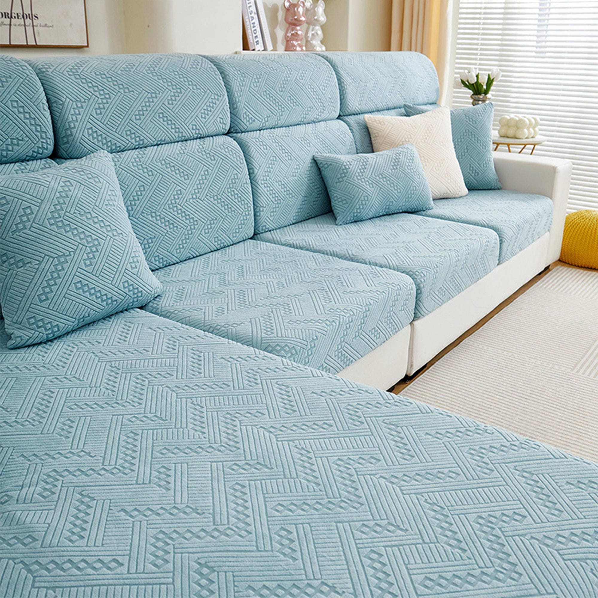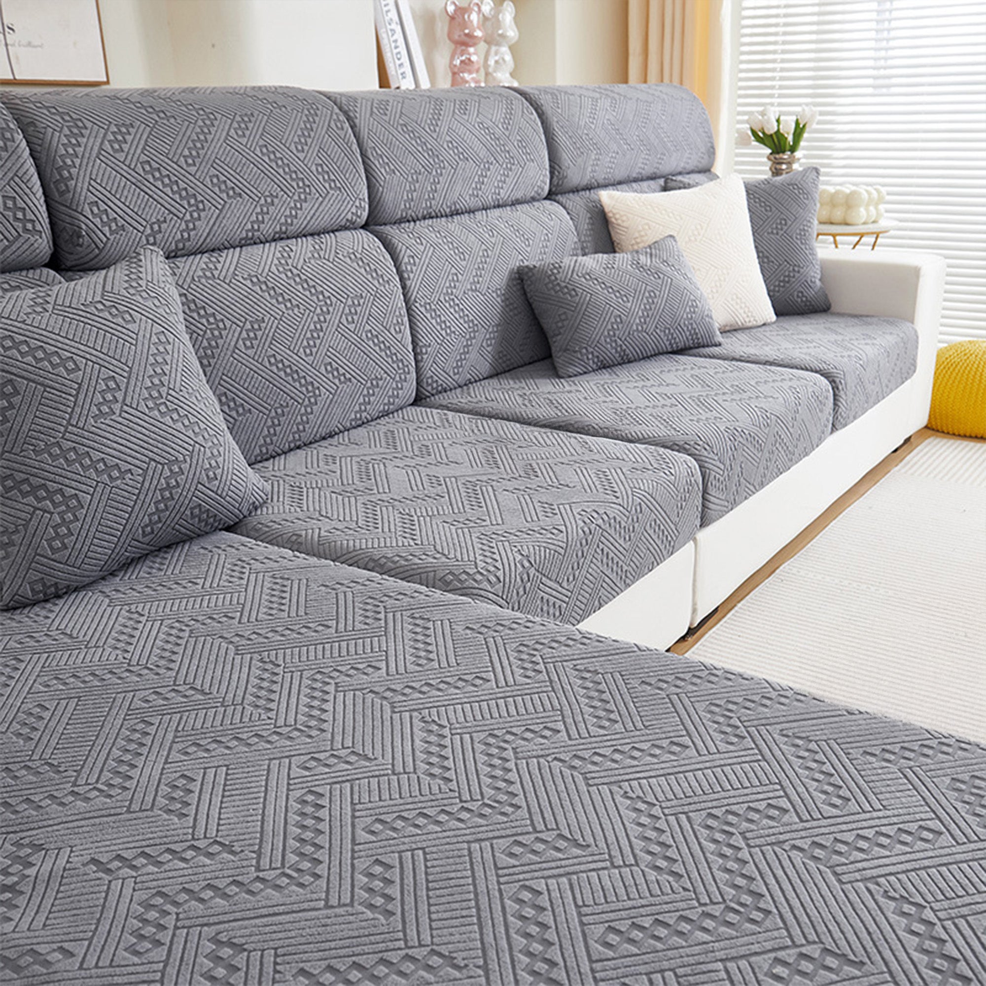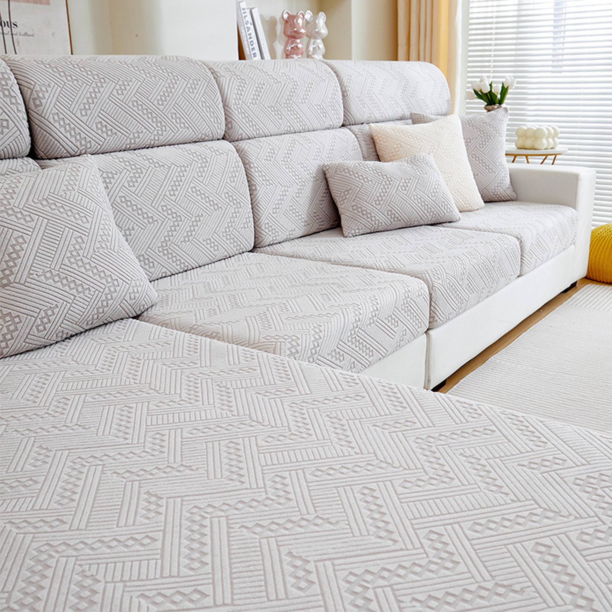Protect and refresh your sofa with our Premium Jacquard All-Season Stretch Sofa Cover. Crafted with a refined woven pattern and tactile texture, it wraps your couch in 360° coverage while delivering a clean, tailored look. The dense, durable fabric resists wear and pet scratches, and the dual anti-slip design keeps every cushion steady—sit, lounge, or jump without shifting.