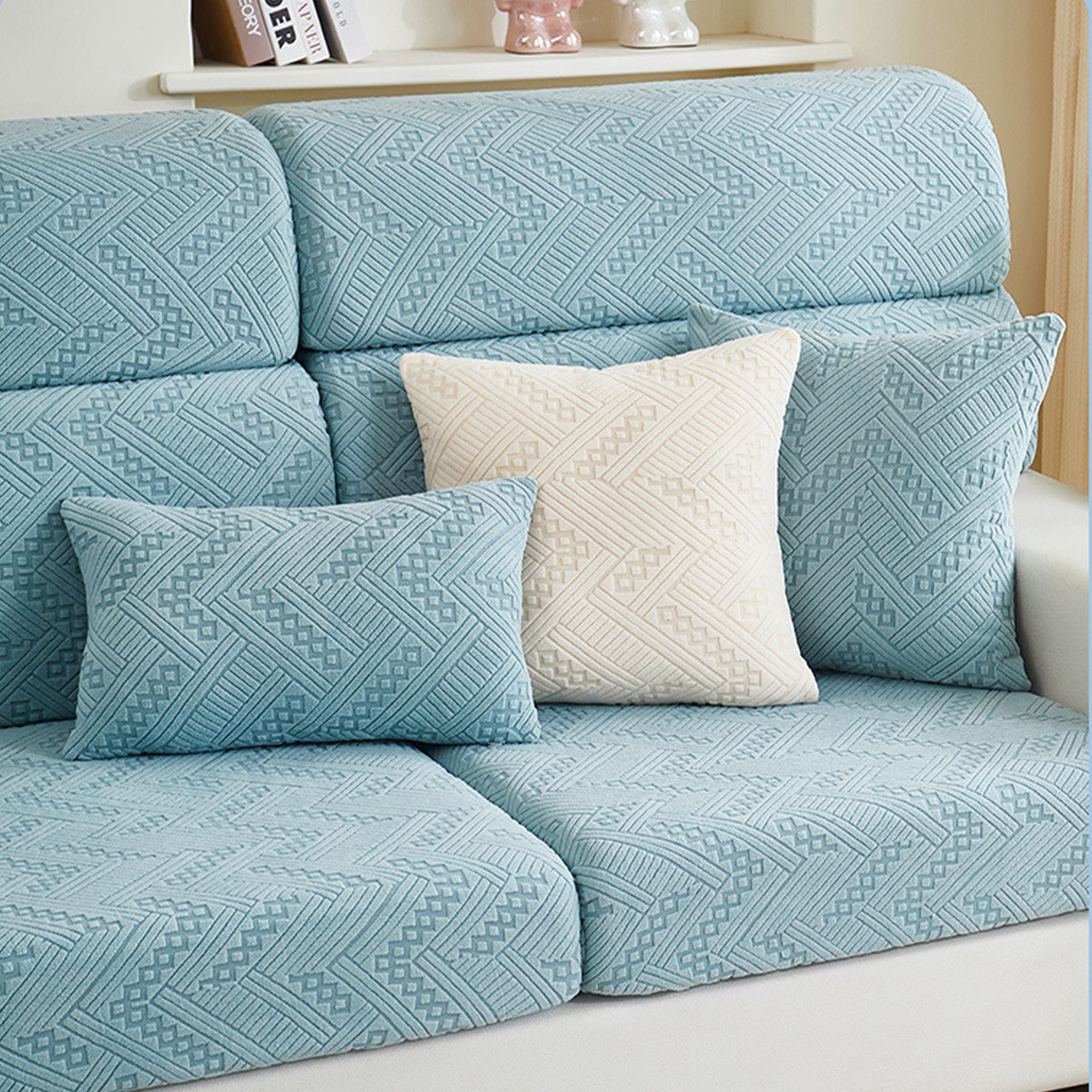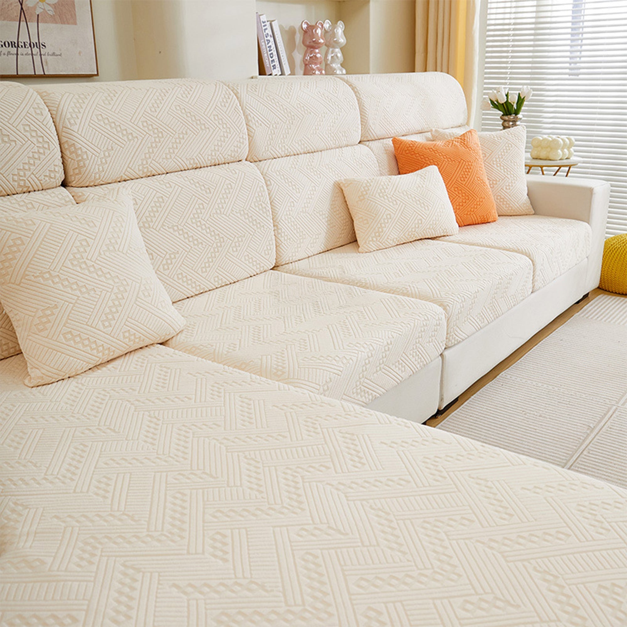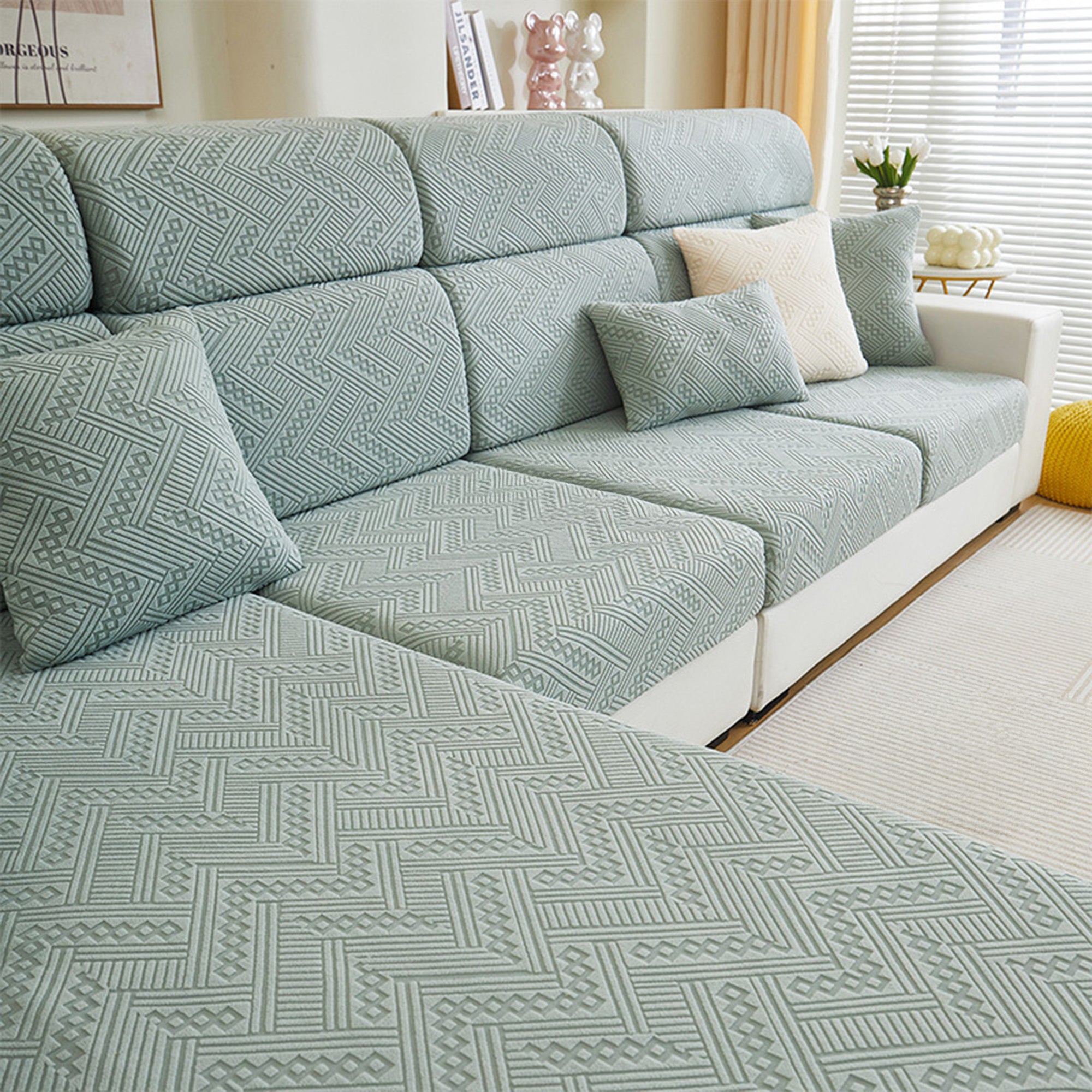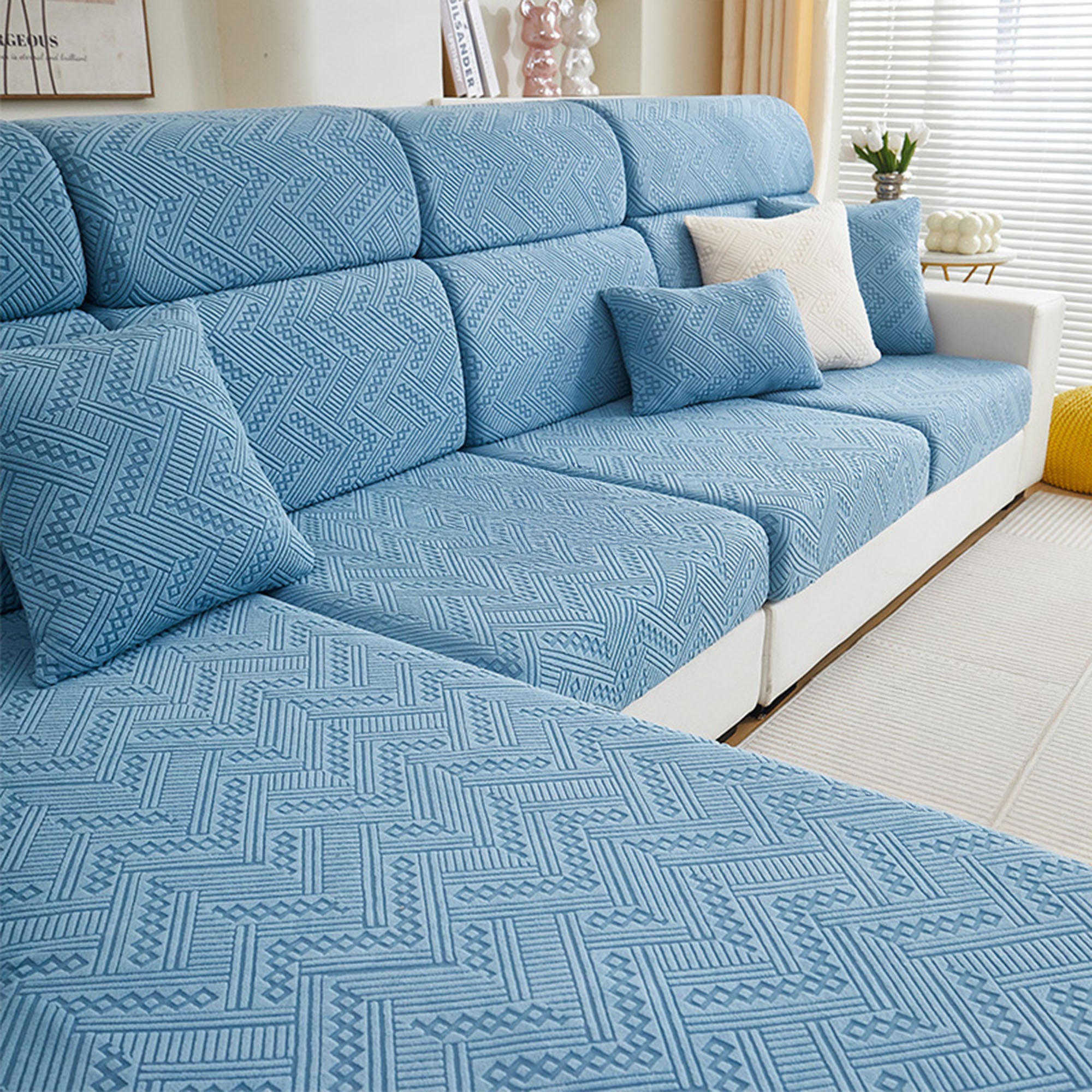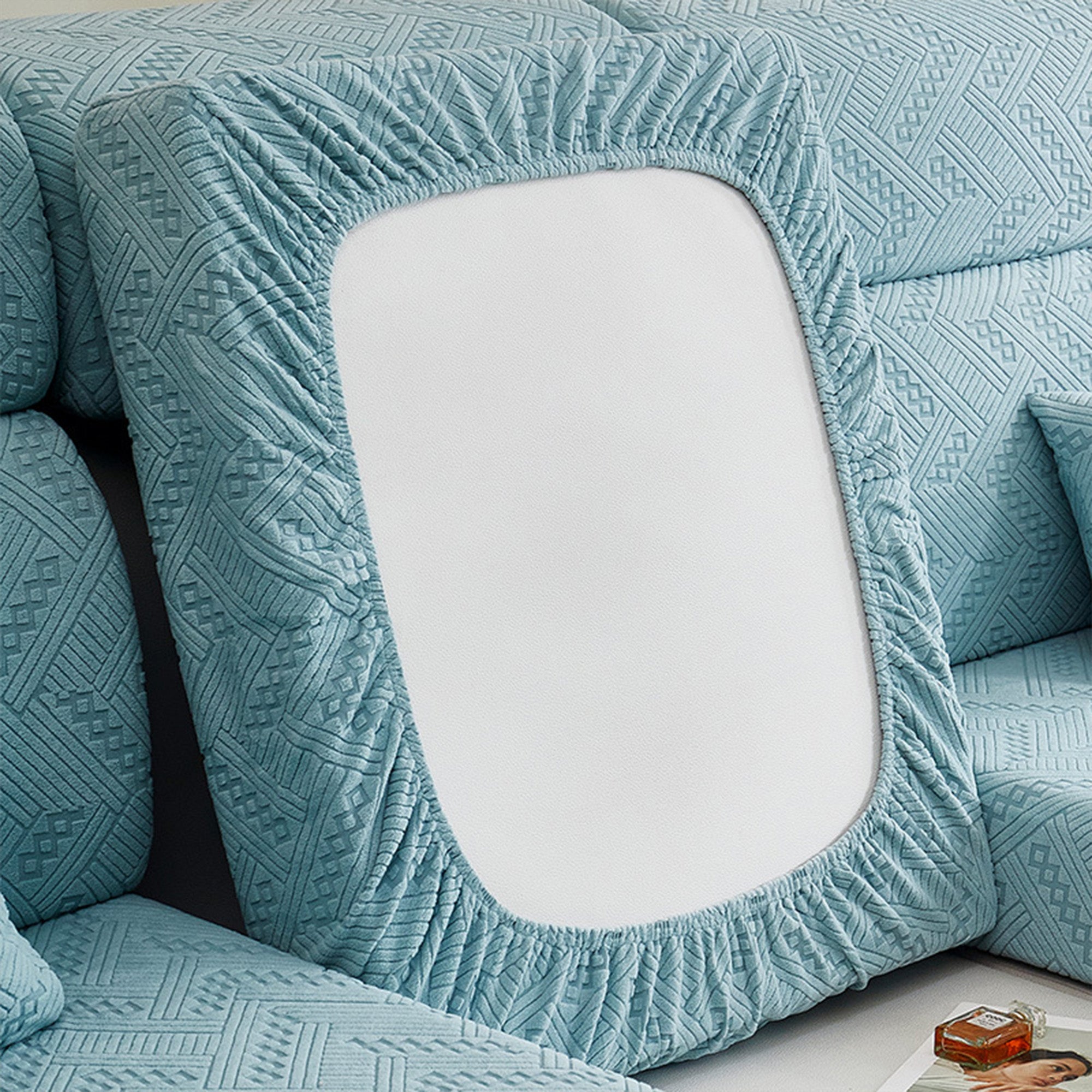 Protect and refresh your sofa with our Premium Jacquard All-Season Stretch Sofa Cover. Crafted with a refined woven pattern and tactile texture, it wraps your couch in 360° coverage while delivering a clean, tailored look. The dense, durable fabric resists wear and pet scratches, and the dual anti-slip design keeps every cushion steady—sit, lounge, or jump without shifting.